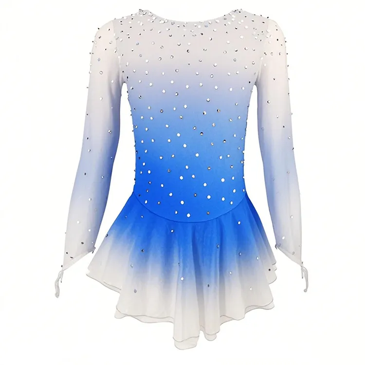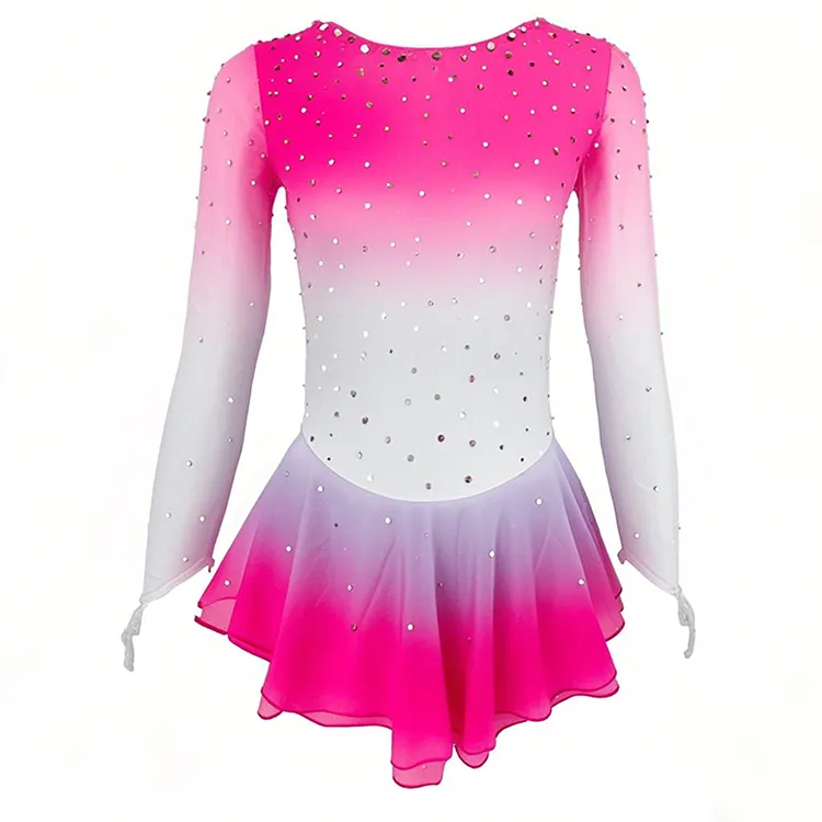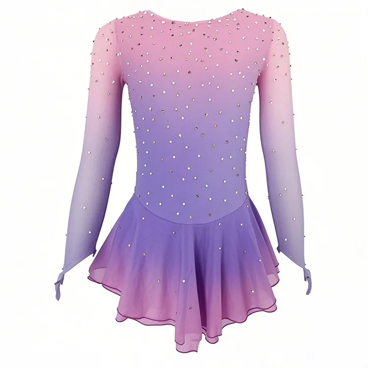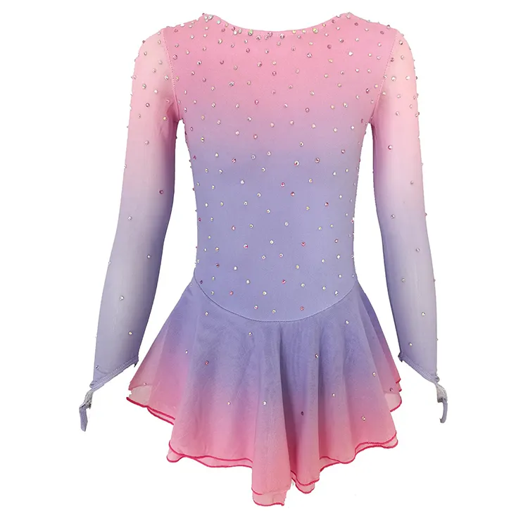 ❤ Features: This figure skating dress is exquisitely designed. The overall color presents a gradient from pink to purple, and several other gradient color options are also available, creating a dreamy atmosphere. The dress is covered with shiny rhinestones, glistening brightly. The long sleeves are made of lightweight mesh fabric, adding a sense of lightness. The hem of the skirt is in an irregular style, lively and playful. The back features a crisscross strap design, which not only gives a fashionable look but also allows for some adjustment of the fit to a certain extent. Combining both beauty and practicality, it is suitable for occasions such as figure skating performances and competitions.