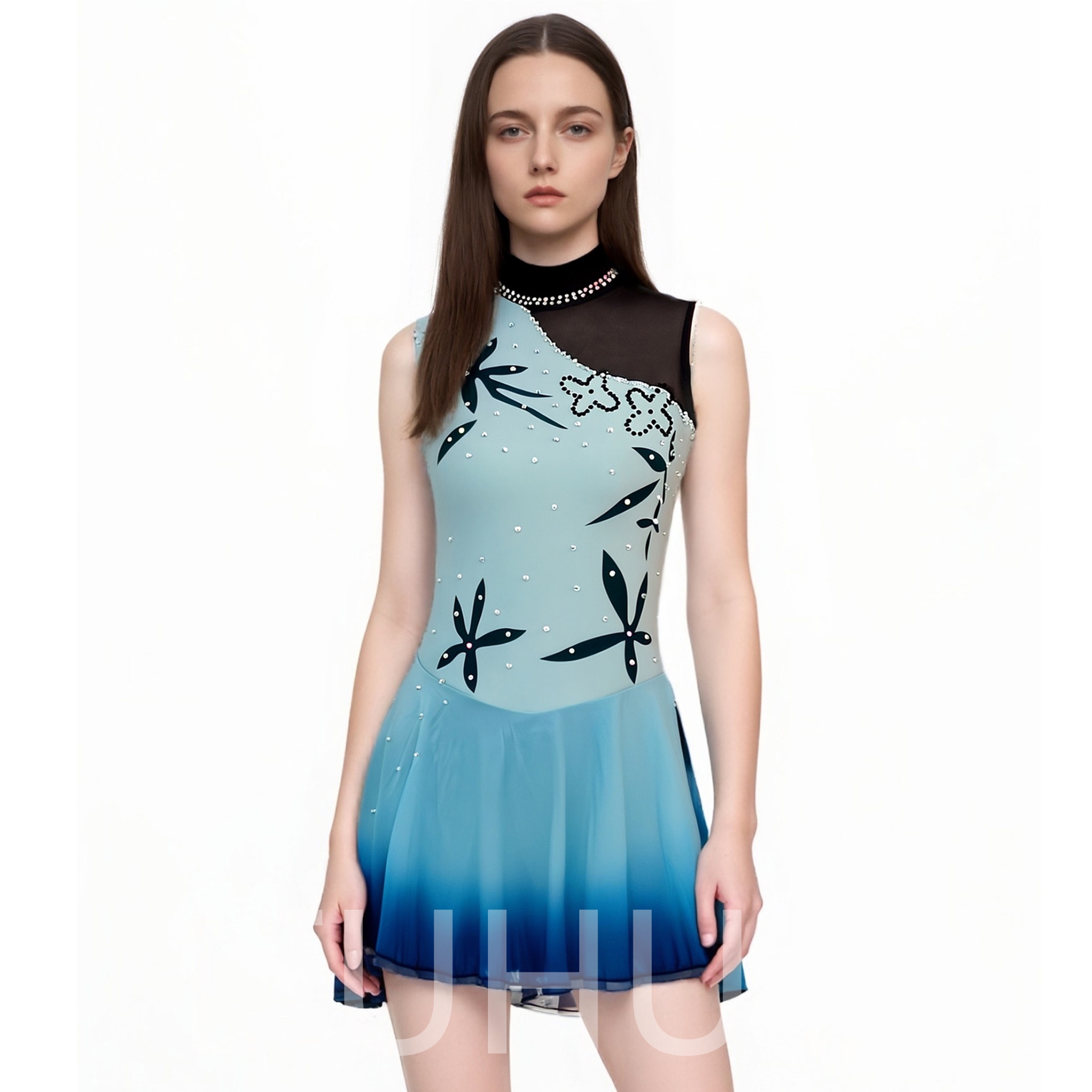 ❤ Features:This LIUHUO figure skating dress in light blue gradient is a visual delight. Its one - shoulder design, adorned with a delicate rhinestone necklace trim, adds elegance. Black floral patterns paired with scattered crystals create a charming contrast. The sleeveless cut and flared skirt allow free movement, perfect for gliding and spins on ice.