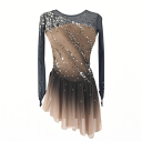 This is a LIUHUO figure - skating dress. It has a gradient color from dark to light brown, decorated with sparkling elements, long sheer sleeves, and an asymmetrical skirt, suitable for figure - skating performances.