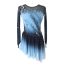 This is a LIUHUO figure - skating dress. It has a gradient color from light blue to dark blue, decorated with sparkling elements, long sheer sleeves, and is suitable for figure - skating performances.
