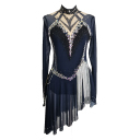 ❤ Features:This is a figure - skating dress. It features a dark color scheme, predominantly black. The dress has long sleeves crafted from sheer mesh fabric, giving it an elegant and airy feel. The upper part of the dress showcases an intricate diamond - shaped cut - out design, adorned with an abundance of sparkling rhinestones that create a dazzling effect. Additionally, there are stylish silver tassel details on the asymmetrical skirt, adding a dynamic touch. This dress is perfect for making a statement in figure - skating performances.