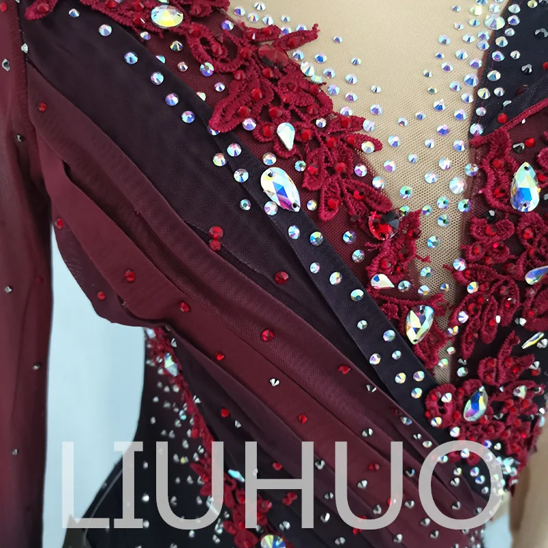 ❤ Features: This LIUHUO skating dress features a unique and exquisite design. The overall color presents a gradient, transitioning from deep red to deep purple, which is rich in a sense of layering and visual impact. It adopts a one - shoulder design, and the long red sleeve on one side adds an elegant touch. The dress is adorned with sparkling rhinestones that complement the red floral - shaped embroidery, exuding a strong sense of luxury. It can attract attention well on the ice, making it suitable for both competitions to showcase one's elegance and performances to enhance charm.